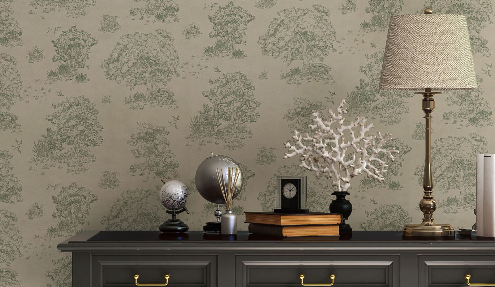 Не забываем, что английский стиль в интерьере зародился в эпоху расцвета барокко. Пышность, изящество, богатство, благородство и некая история должны читаться в каждой детали. Английский стиль эклектичен, а значит в нём может быть всё и сразу. Растительные сюжеты на стенах, декоративных подушках и шторах, коллекция снимков с ботанической тематикой или даже бабочек в рамках, географические старинные карты, вырезки из газет и журналов, старые исторические или семейные фотографии. Здесь же можно встретить такие экзотические «экспонаты» как африканские маски, бусы, веера, античные греческие вазы, восточные ковры, металлическую персидскую посуду (не забываем о традиционном британском и китайском фарфоре). Так же приветствуются живопись и гобелены в резных декоративных рамах.