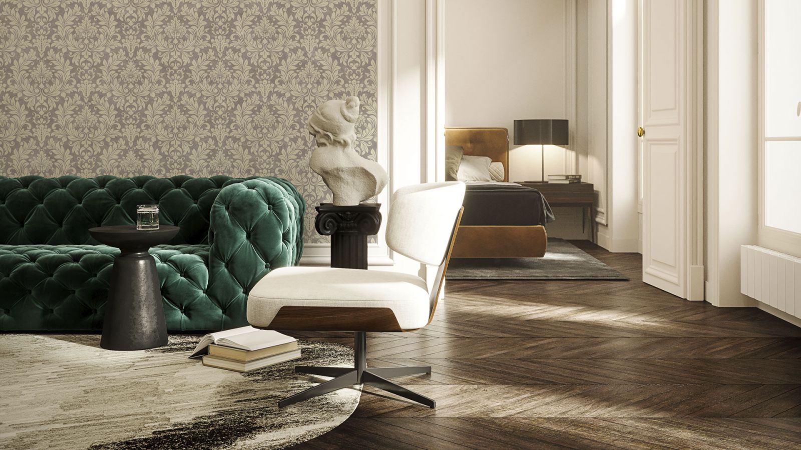 Как и несколько столетий назад, на полу в современном парижском стиле мы видим благородный деревянный паркет с узором «ёлочка». Это могут быть и более современные материалы (паркетная доска или ламинат), но обязательно тёплых древесных оттенков. Идеально, если напольное покрытие будет с эффектом благородной старины. Чтобы придать интерьеру многослойность и изюминку, можно на по положить ковёр. Во влажных помещениях (кухонной зоне, ванной) предпочтение отдаётся керамограниту и плитке светлых тёплых оттенков.