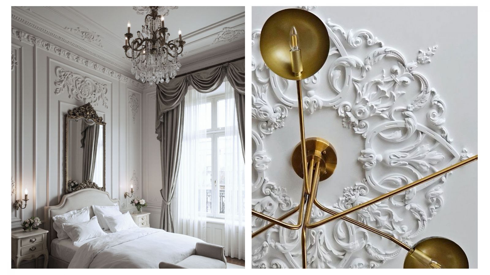 Главным выступает белый цвет и его оттенки – молочный, слоновая кость, бежевый и т.д. Такая цветовая палитра наполнит даже малометражную комнату воздухом и светом. Чтобы монотонные стены и потолок не выглядели скучными, их украшают лепниной, молдингами, плинтусами, розетками с узором и другими объёмными элементами. Разбавить белую цветовую гамму помогут лавандовые, песочные, охристые, розовые, голубые тона. Очень важно помнить, что французский стиль любит сдержанную роскошь, но без золотых линий здесь не обойтись. В таком интерьере вы обязательно увидите золотые «солнечные» акценты. Также в качестве акцента можно использовать и более насыщенные, тёмные цвета – бордовый, синий, терракотовый, зелёный.