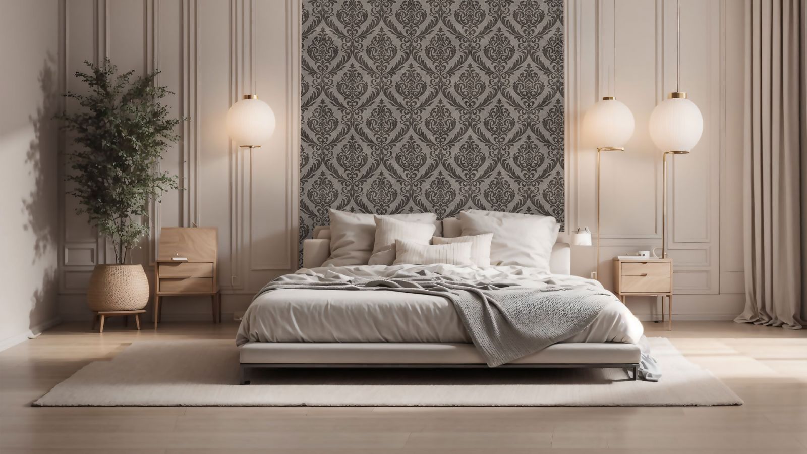 Спальня в современном французском стиле лёгкая и воздушная, в ней лишь лёгкий флёр помпезности и роскоши. Большая кровать с изогнутым изголовьем, тюль и плотные шторы. Стену за кроватью можно украсить обоями с ненавязчивым цветочным орнаментом. Не перегружайте комнату мебелью. Достаточно прикроватной тумбы со светильником, пуфика, туалетного столика. Если есть возможность отказаться от массивного шкафа в пользу встроенных решений или современной минималистичной модели, воспользуйтесь ею. На стенах в качестве декора можно повесить картину или несколько фотографий. Но не перестарайтесь. В данном случае лучше один элемент декора, чем целая картинная галерея.