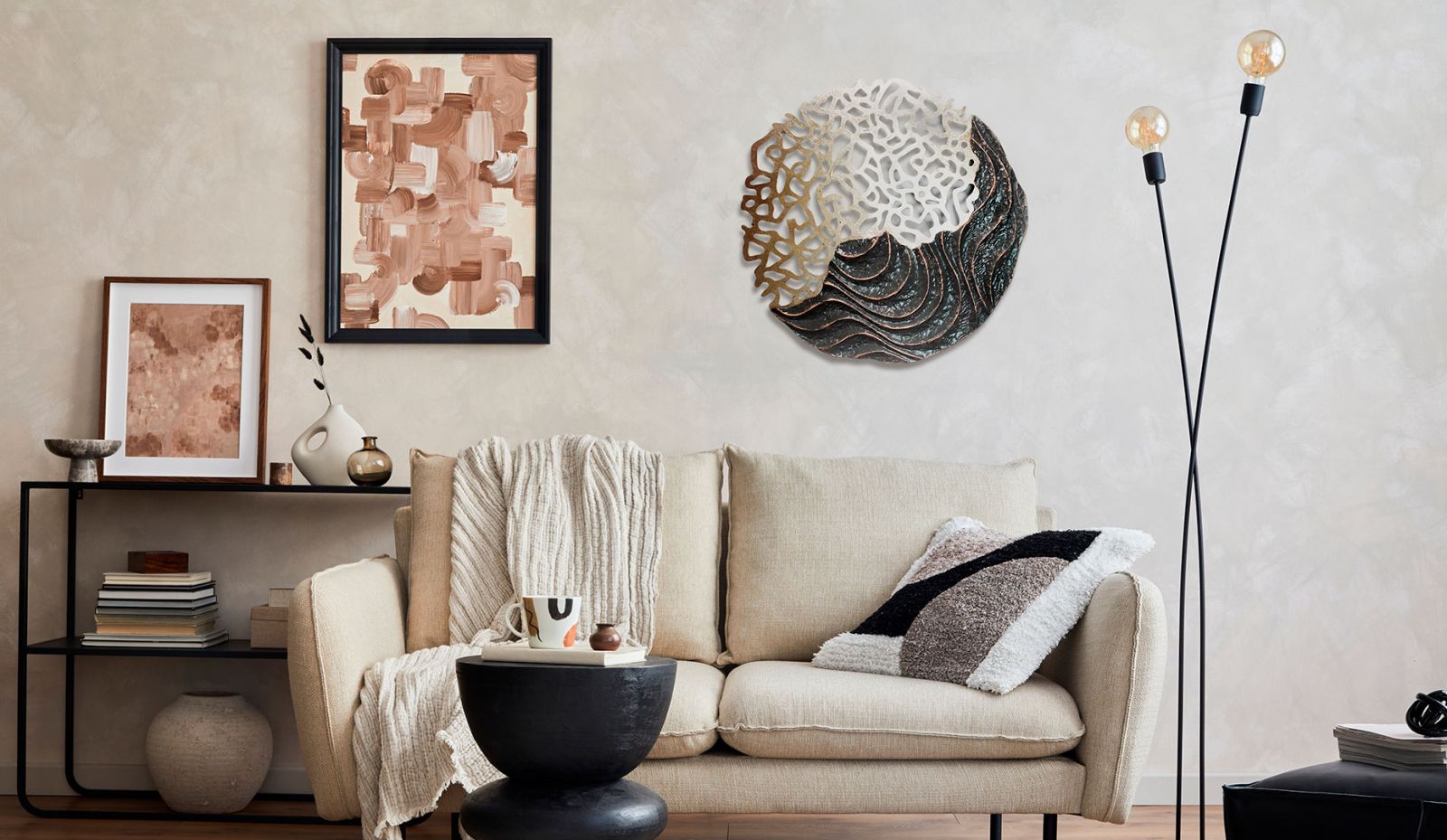 Галерея – это не только картины и фотографии. Объемный декор придаст вашей композиции глубину и уникальность! Металлические панно, декоративные тарелки и другие элементы, размещённые как в строгом порядке, так и в свободной, чуть хаотичной манере, создадут эффект эклектики, добавят нотку домашнего уюта и разнообразят визуальное восприятие.