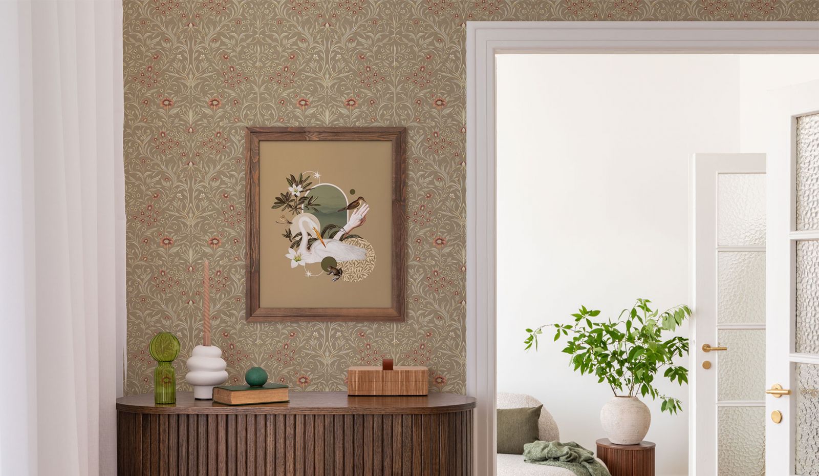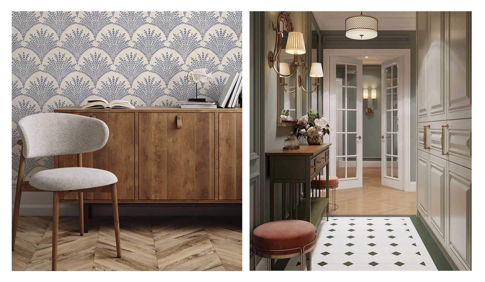 Как правило, стены в переходном стиле являются лёгким ненавязчивым фоном. Из материалов предпочтение отдаётся фактурной штукатурке, декоративному кирпичу с эффектом натуральной кладки, деревянным панелям. Чтобы привнести ту самую индивидуальность и изюминку в переходный интерьер, отличным выбором станут обои с лёгким ненавязчивым сюжетом. Гармоничные цветовые вариации, дизайнерские сюжеты на любую тематику (будь то классические узоры и вензеля или та же имитация природных текстур) позволят создать оригинальный акцент на определённой зоне вашего пространства, наполнят его смыслом и оригинальностью. К тому же, они максимально экологичны, подходят для размещения в спальнях и детских комнатах.