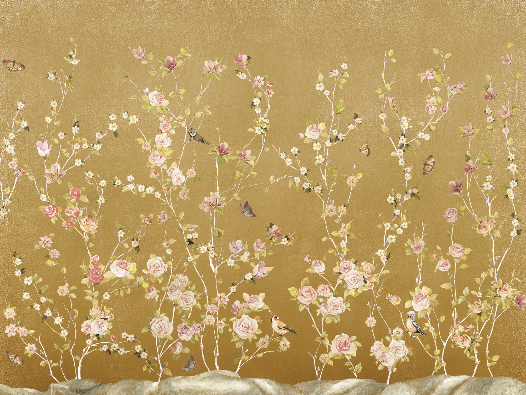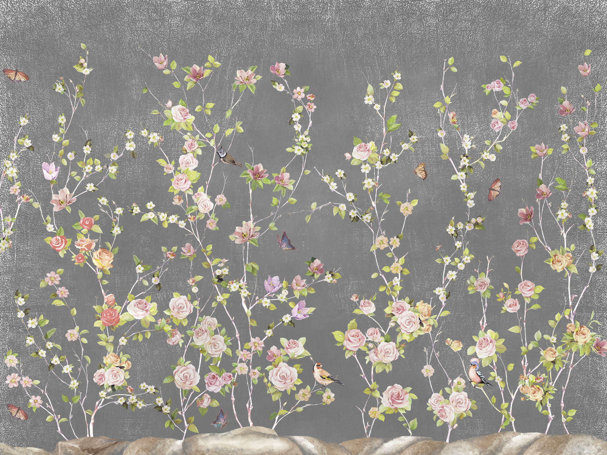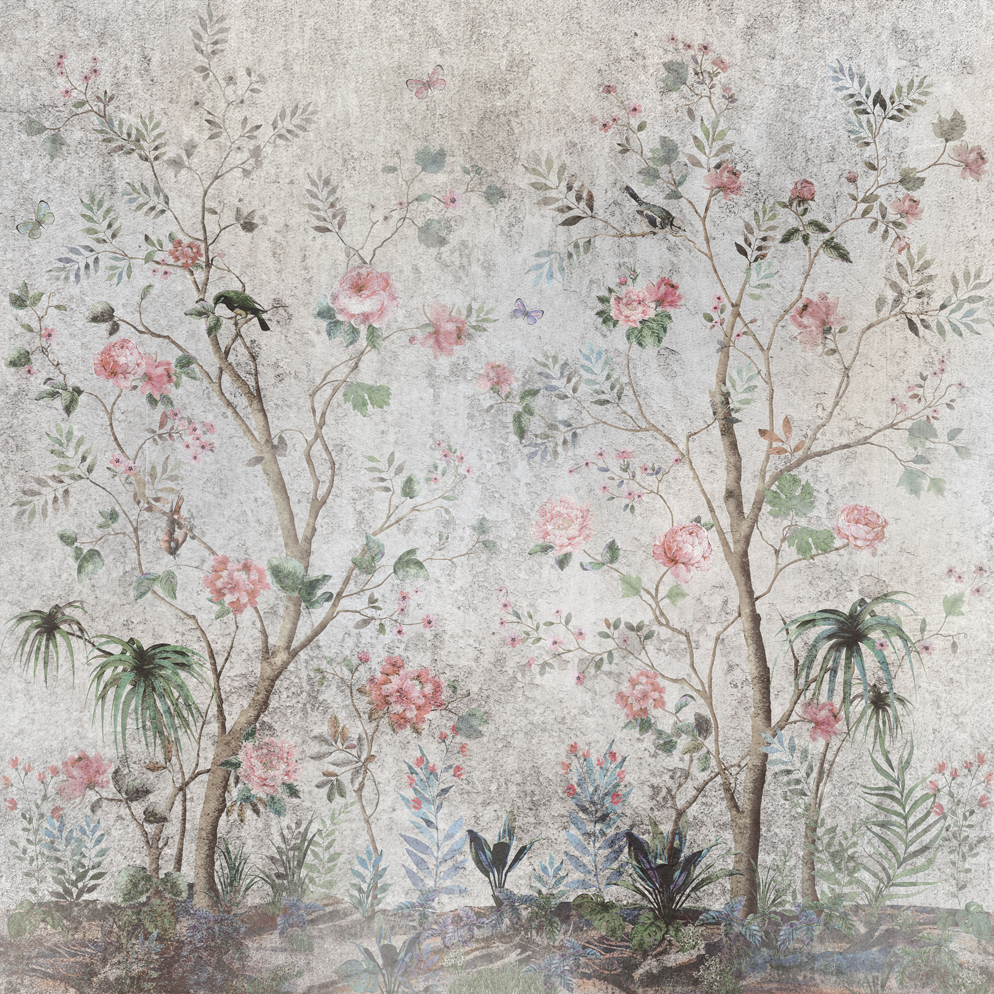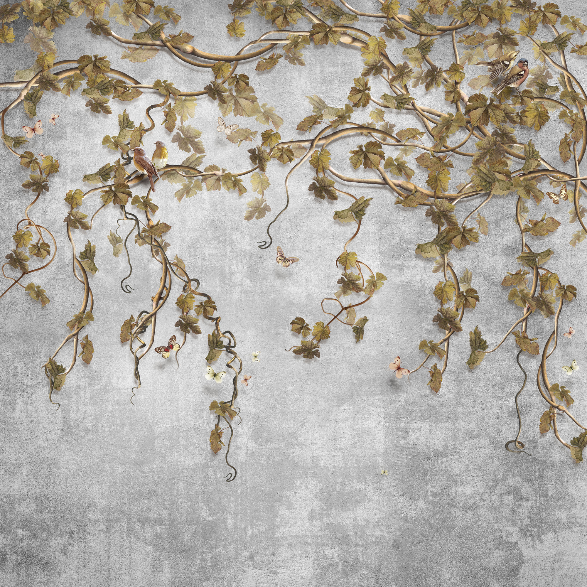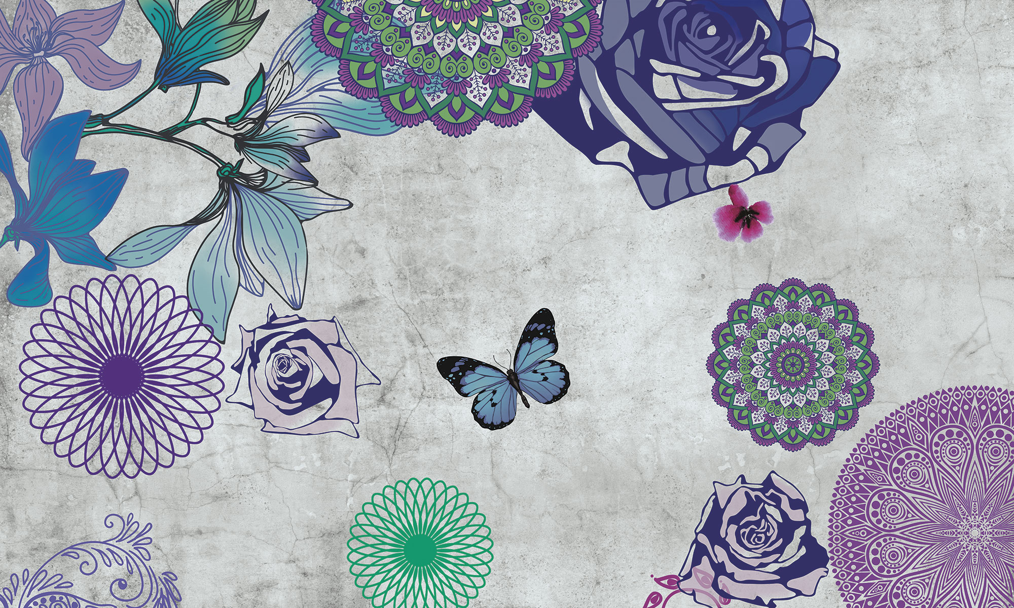 Цветы и бабочки на бетонном фоне